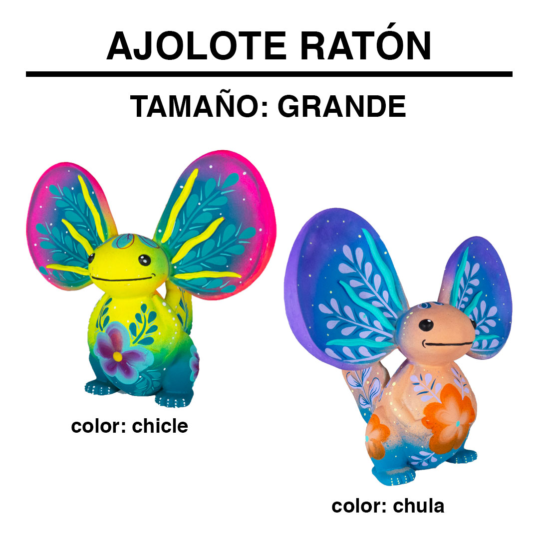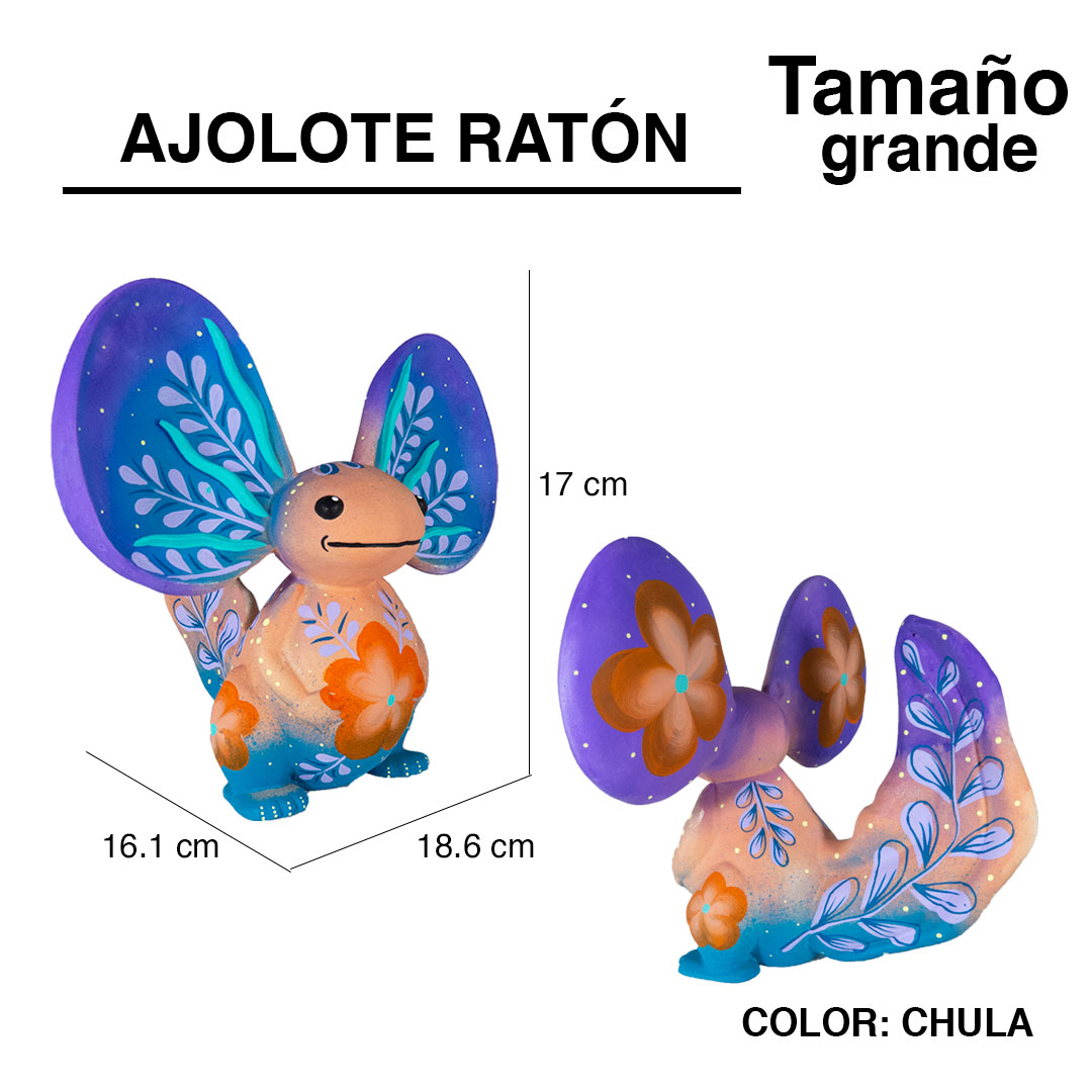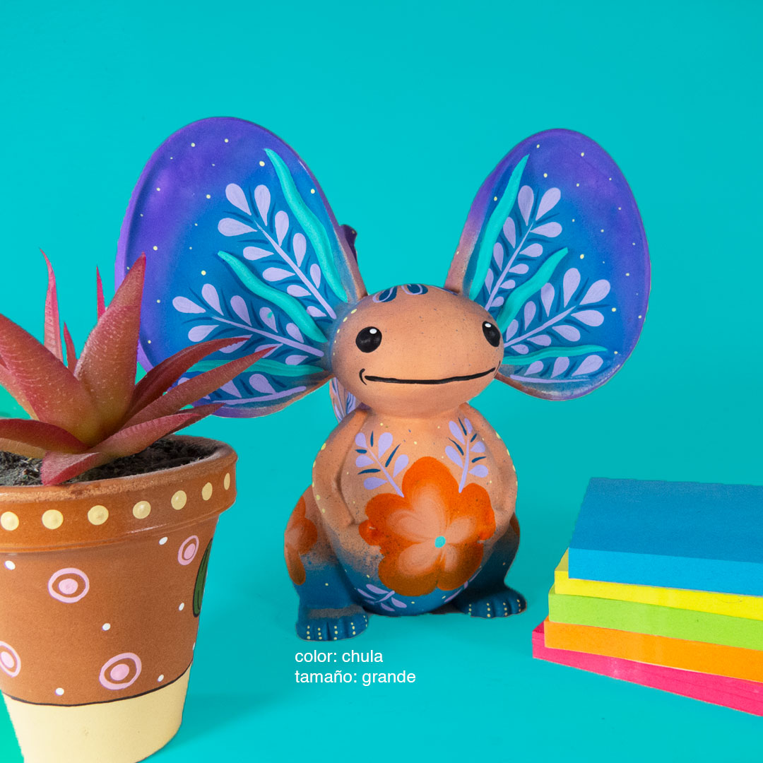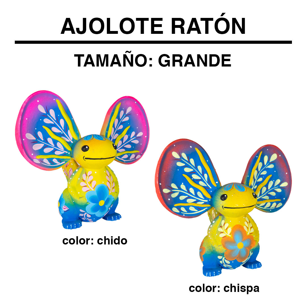 El ajolote ratón es la semilla, el alimento, las siembras, la germinación, la vida, la creación, el amor. Eres creativo, adaptable; buen defensor de otras personas. Buscas la tranquilidad y la armonía. Técnica Artesanal: alebrije de resina pintado a mano con pinturas acrílicas.