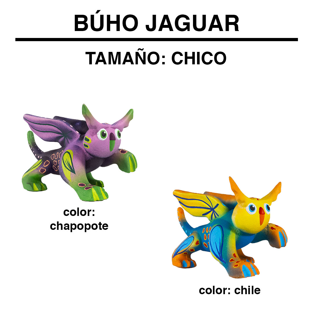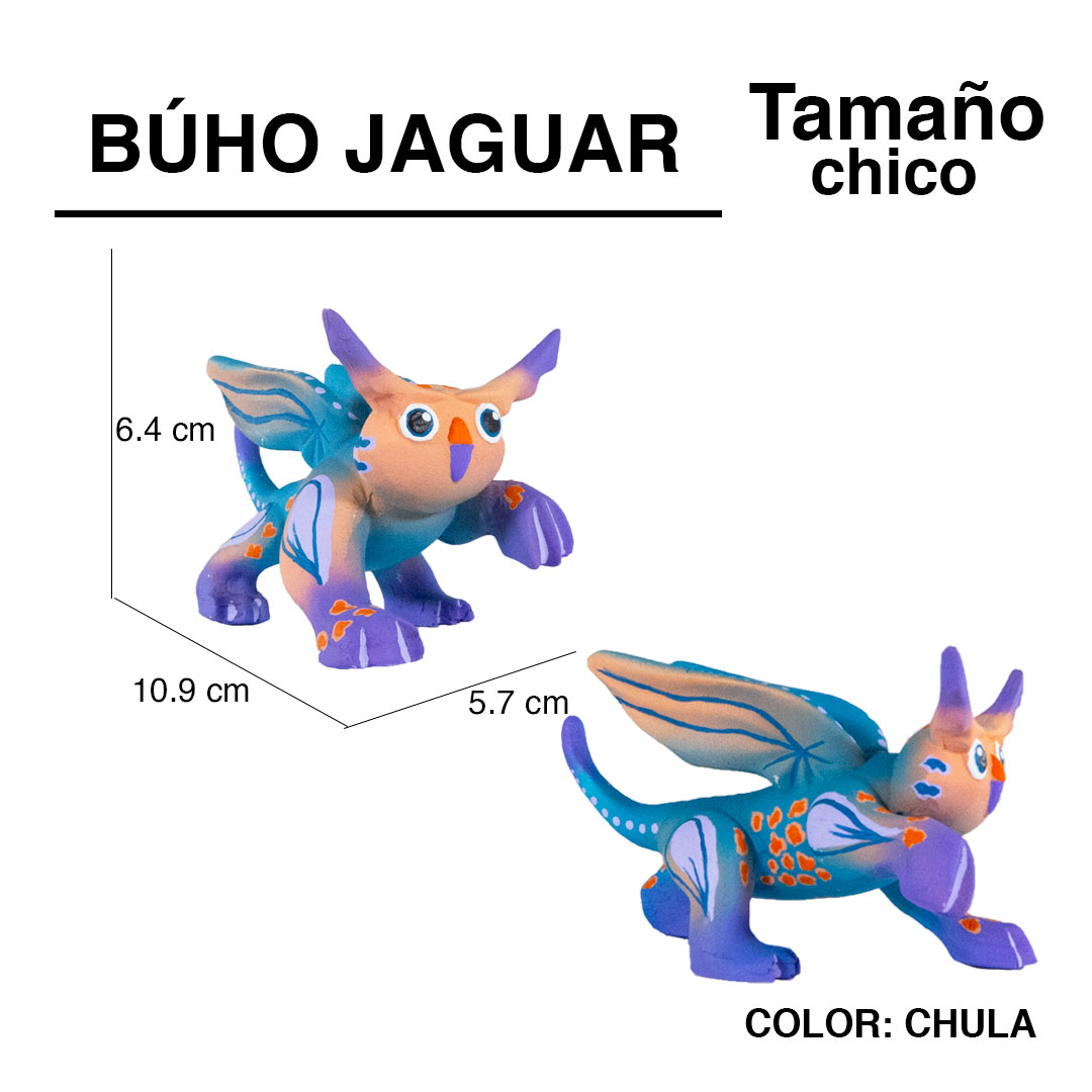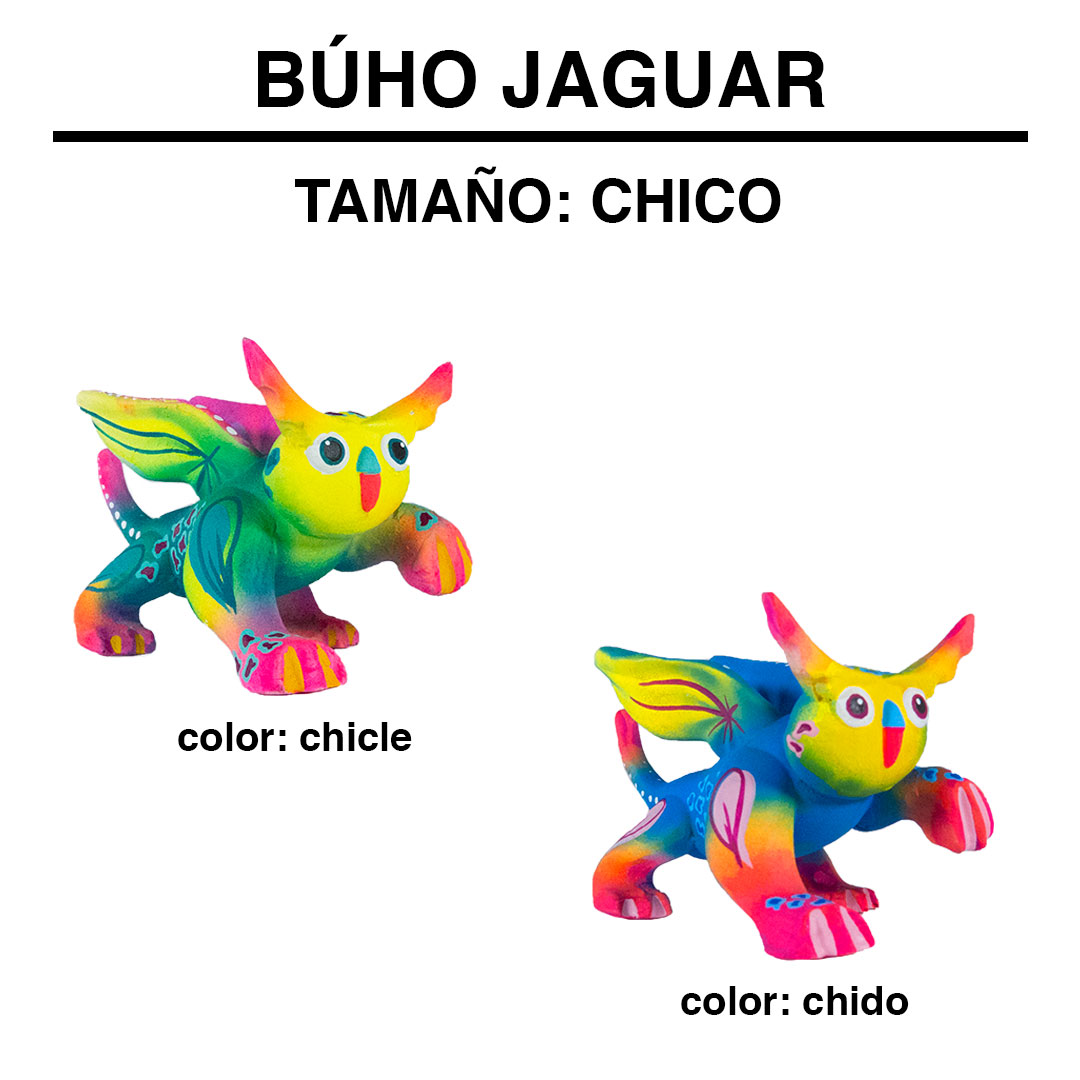 El búho jaguar representa el principio, la armonía, la visión, la astucia e inteligencia. Eres una persona muy paciente, de buen proceder, de buena actitud, no existe día difícil para ti. Técnica Artesanal: alebrije de resina pintado a mano con pinturas acrílicas.