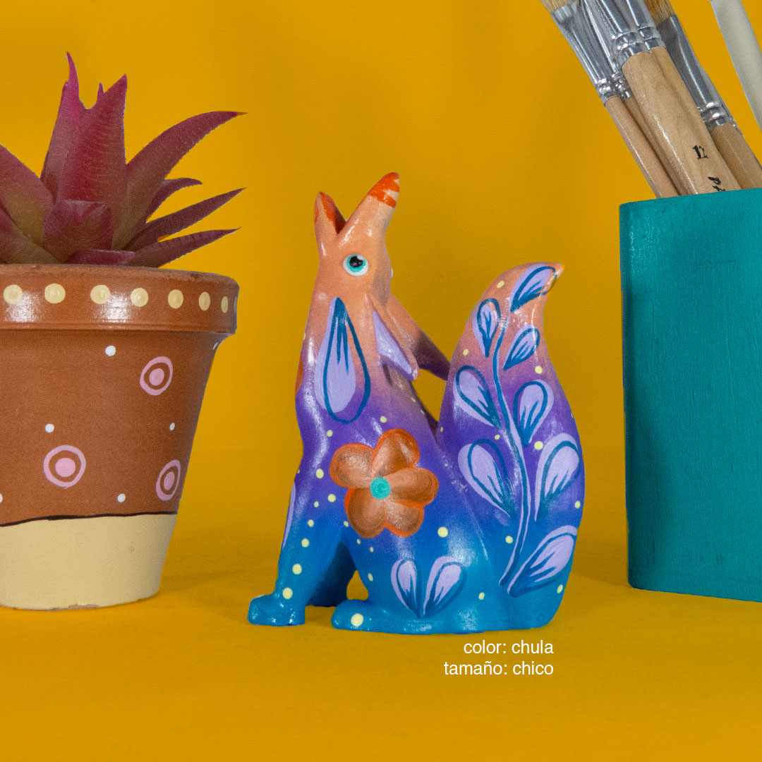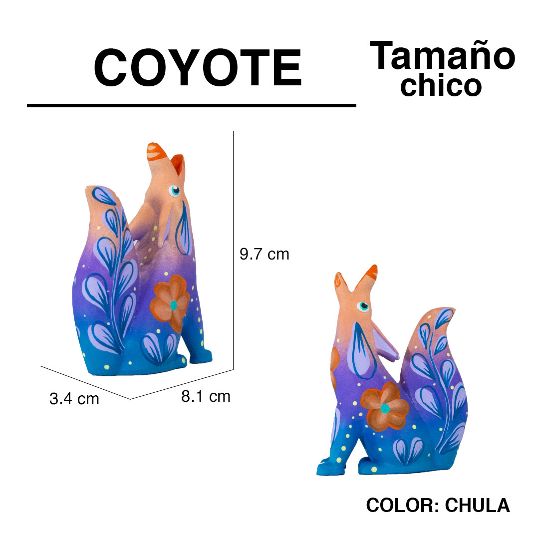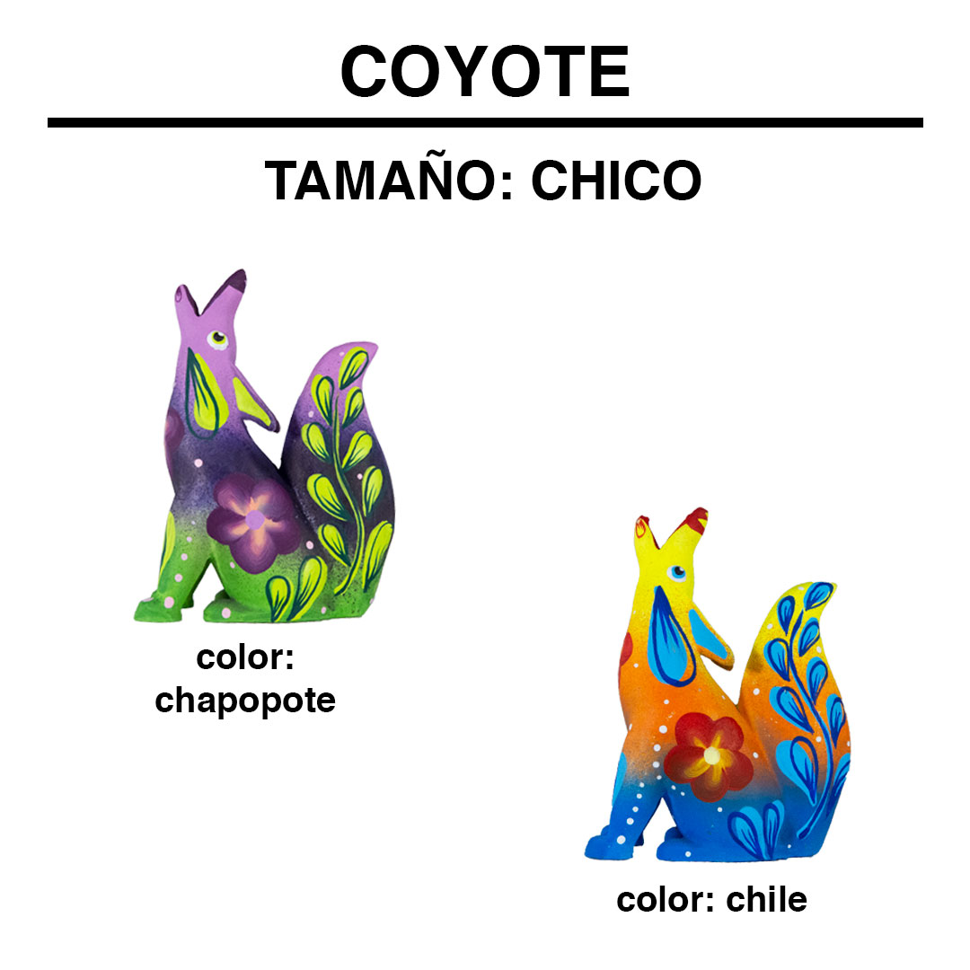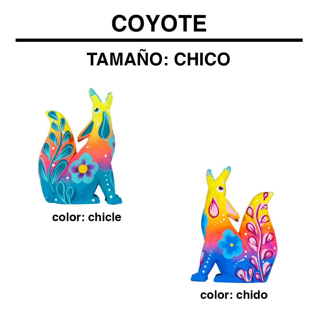 El coyote representa a personas inteligentes, de una memoria sana, idealistas y con rapidez mental. Son espirituales, sabios, artistas, razonables y lógicos. Técnica Artesanal: alebrije de resina pintado a mano con pinturas acrílicas.