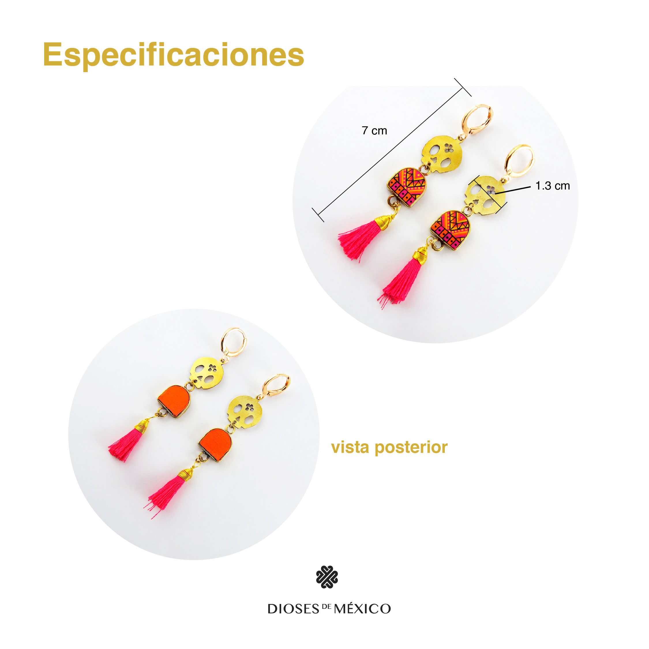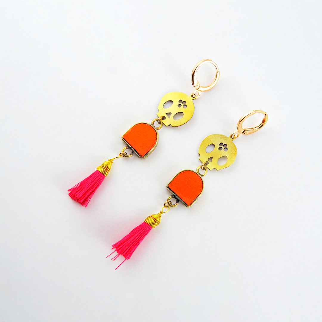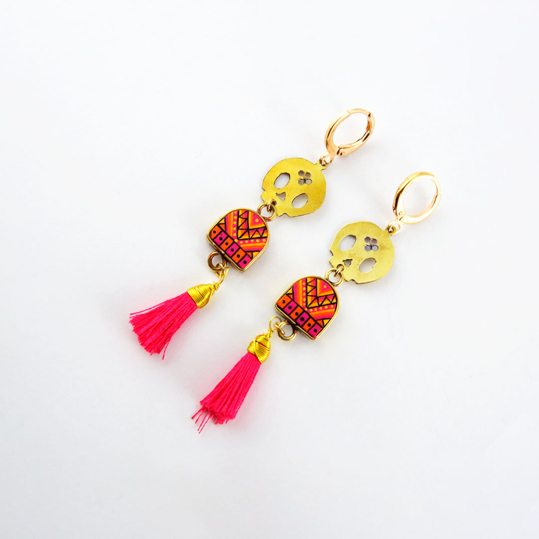 Aretes con dijes de calavera de acero inoxidable y piezas en forma de arco de madera reciclada decoradas a mano con pinturas acrilicas. Las piezas decoradas están protegidas con un pelicula delgada de plástico para que no se despinten. Los arillos son de acero inoxidable con chapa de oro. Incluyen caja de obsequio al puro estilo chilango.