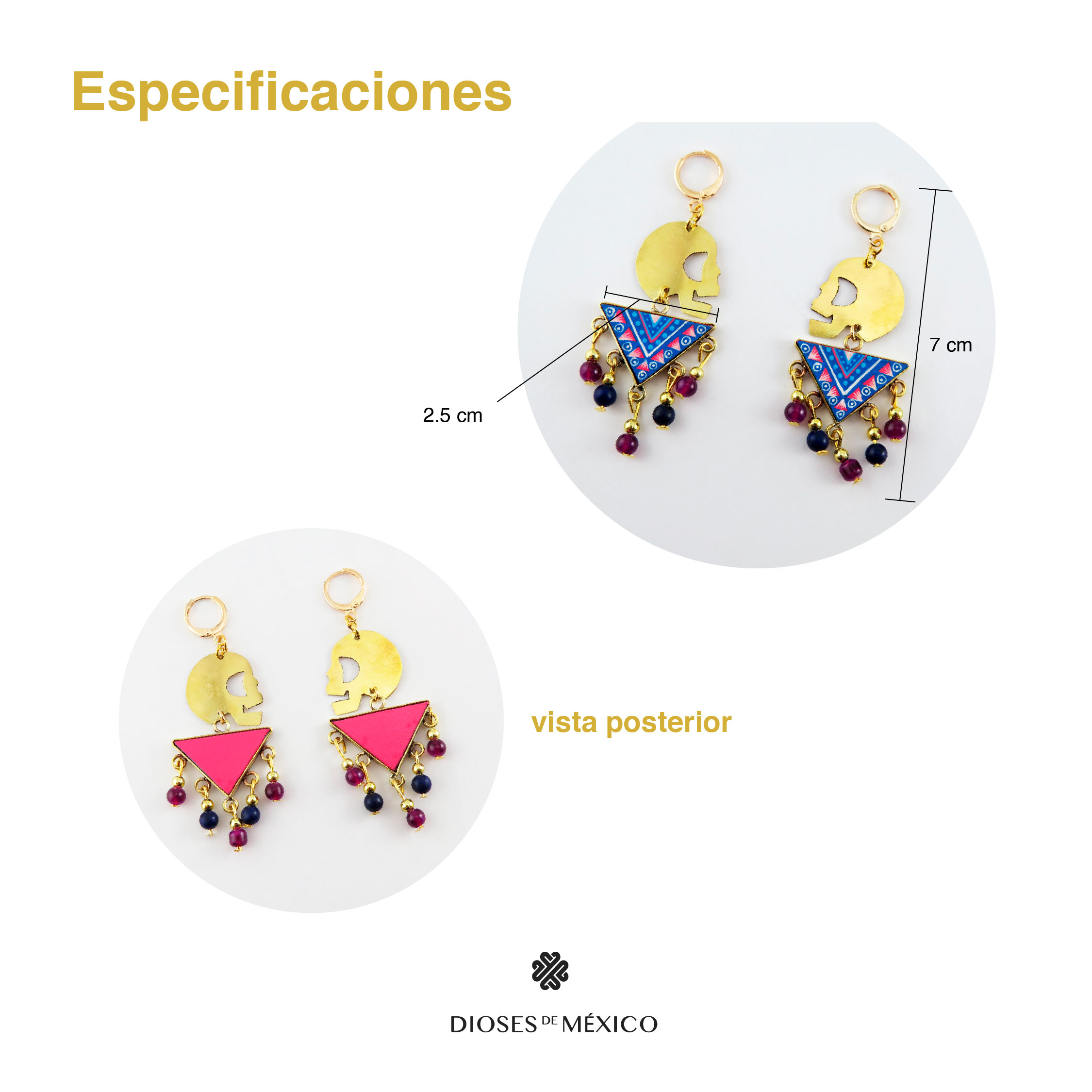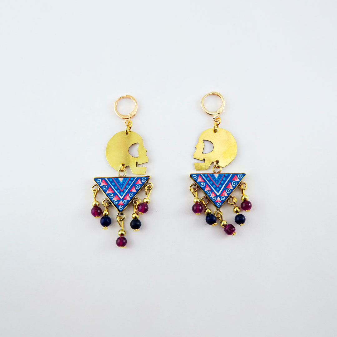 Aretes con dijes de calavera de acero inoxidable y piezas en forma de triángulo de madera reciclada decoradas a mano con pinturas acrilicas. Las piezas decoradas están protegidas con un pelicula delgada de plástico para que no se despinten. Los arillos son de acero inoxidable con chapa de oro. Incluyen caja de obsequio al puro estilo chilango.